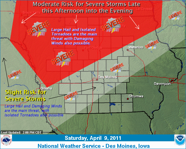 The forecast has generally remained the same since yesterday. The severe weather is expected to first impact the state this evening around 5:00 pm – 8:00 pm, followed by a second round of storms late Sunday afternoon and evening. The primary threat for storms tonight is in northern Iowa, with large hail and isolated tornadoes […]