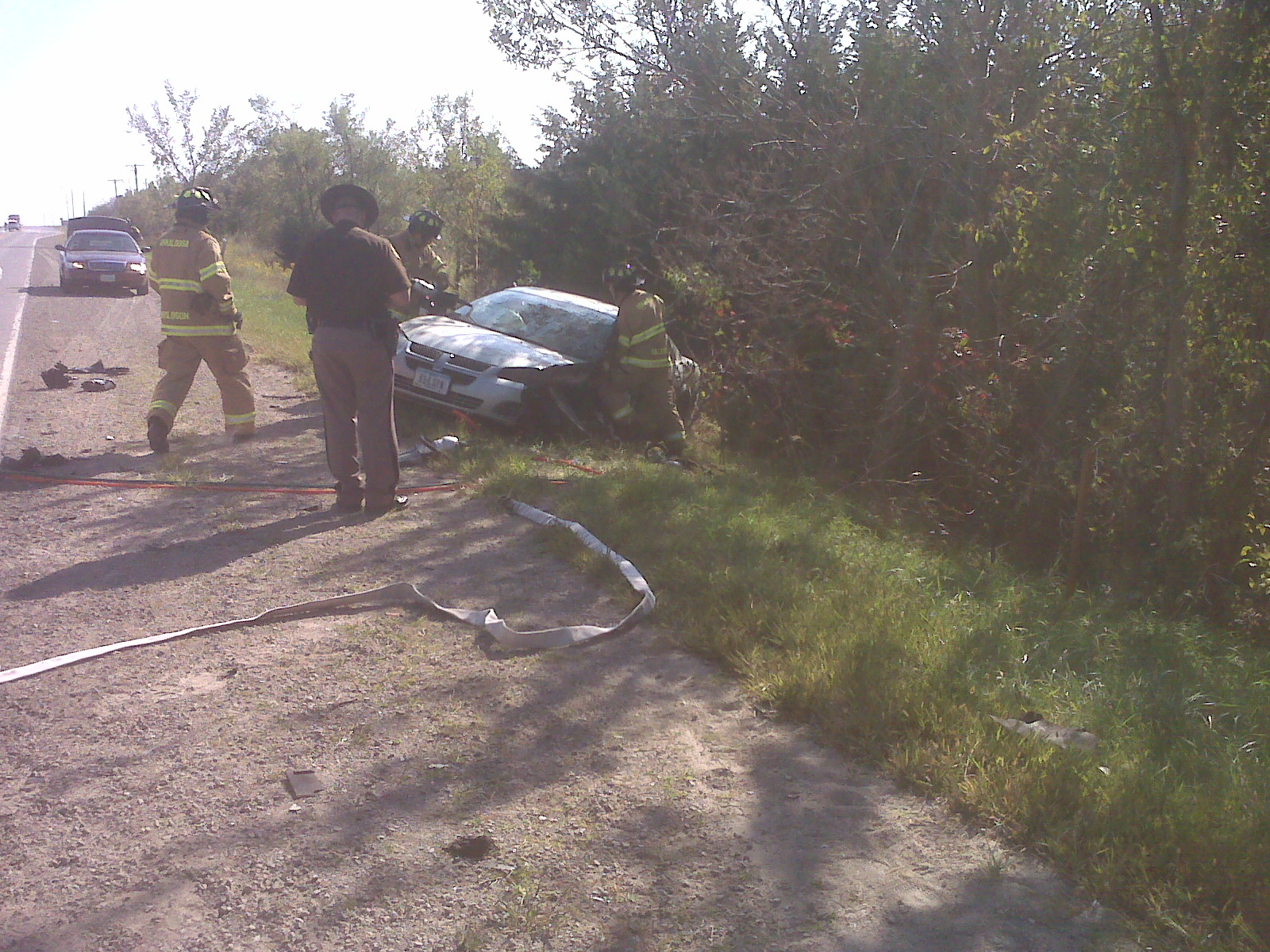 A semi-truck driven by Kenneth Armstrong of Alberta, Canada was heading north on Highway 23 when it’s rear trailer tires dropped off the edge of the road and then crossed the center line striking a south bound car. The driver of the car driven by Jerry Mitchell. Mitchell had to be cut from the damaged Dodge Stratus. When the trailer of the semi went off the road, it also struck a pedestrian.