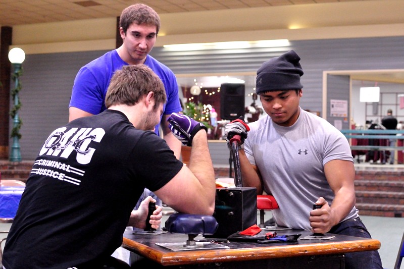 Brian Willett (top center) gets another armwrestling match underway at Penn Central Mall on Saturday.