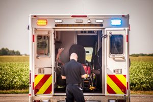 Firefighters were treated on scene for heat related stresses by paramedics. Two firefighters get some rehab in the back of this Mahaska Health Partnership ambulance during Thursday’s fire.