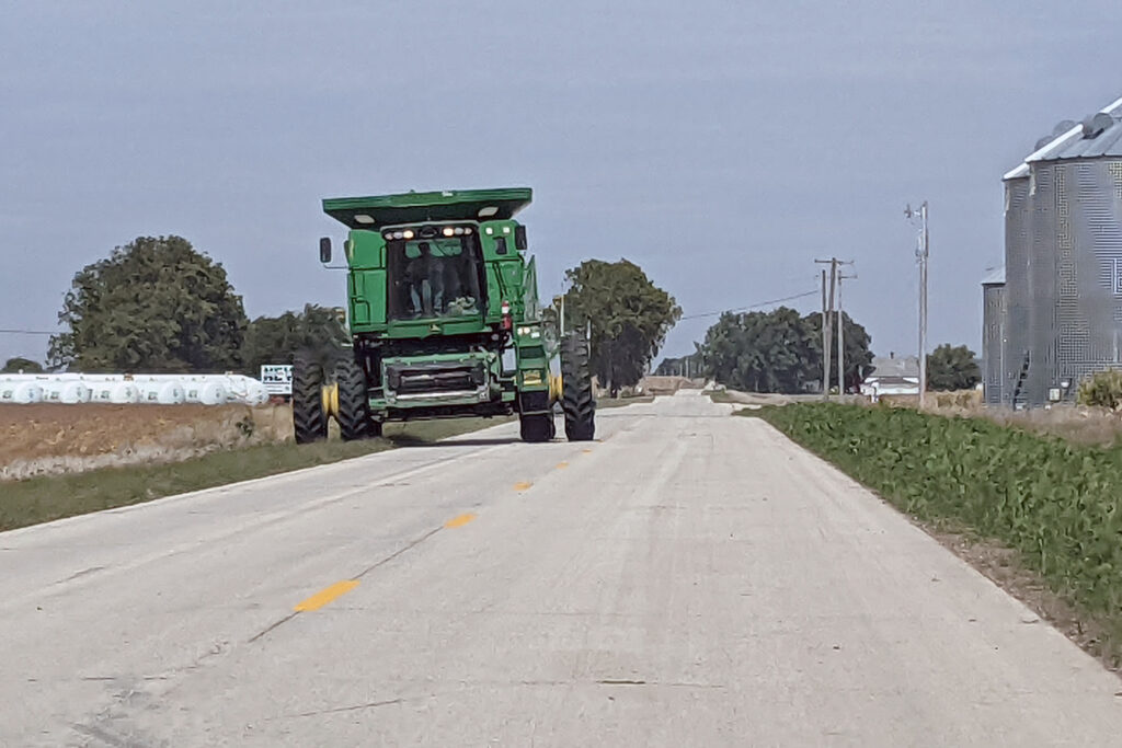 President Joe Biden and administration officials are kicking off an “Investing in Rural America” event series, starting with a visit to a Minnesota farm Wednesday. Shown is farm equipment rolling down an Iowa highway as harvest gets underway. (Photo by Jared Strong/Iowa Capital Dispatch)