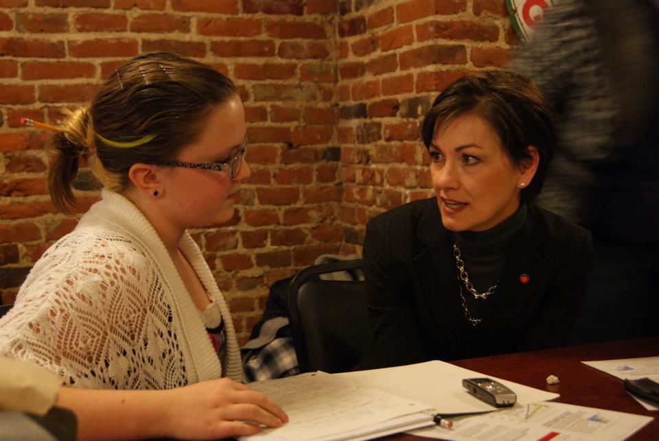 Oskaloosa student Candace Allsup talks with Lt. Governor Kim Reynolds. The Lt. Governor and Governor are now inviting schools to Skype with them to provide similar opportunities to student throughout the state.