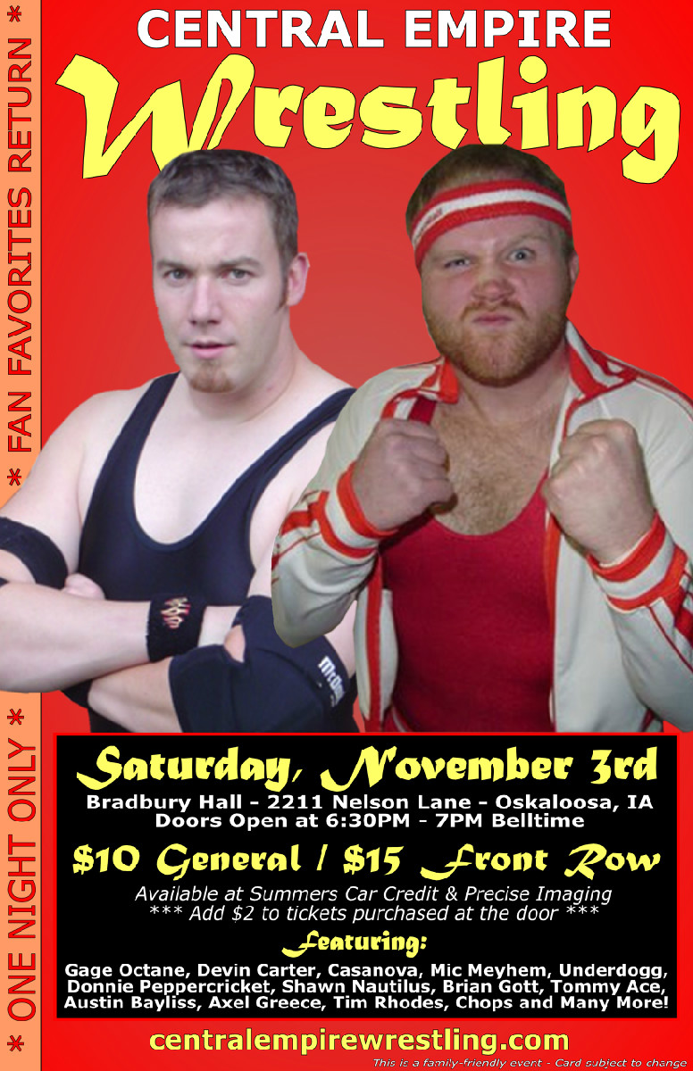 Before the name Dimitrius had ever been announced at a CEW event, Zac James had been establishing a name for himself around Iowa. James performed for CEW in the early days of the company, including the first CEW show in Oskaloosa in 2007. Fast forward to 2012, and Shawn Nautilus is a mainstay. As a huge fan favorite in CEW, Nautilus morphed from the evil Dimitius, to a beloved main event superstar. James has been absent in CEW for years, and is very bitter about that fact. Will James return to CEW and topple one of the top guys in CEW today, or will Nautilus show James exactly why he is a main event star in CEW? It all goes down November 3rd at Bradbury Hall.