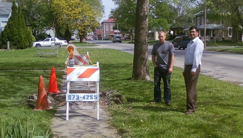 Nathan Willey with Oskaloosa Public Works (left) and Akhilesh Pal, Oskaloosa Public Works Director (right) check out a sidewalk along South Market