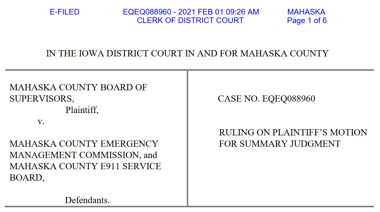 Court case between Mahaska County Board of Supervisors and Mahaska County E911 Service Board and Mahaska County Emergency Management.
