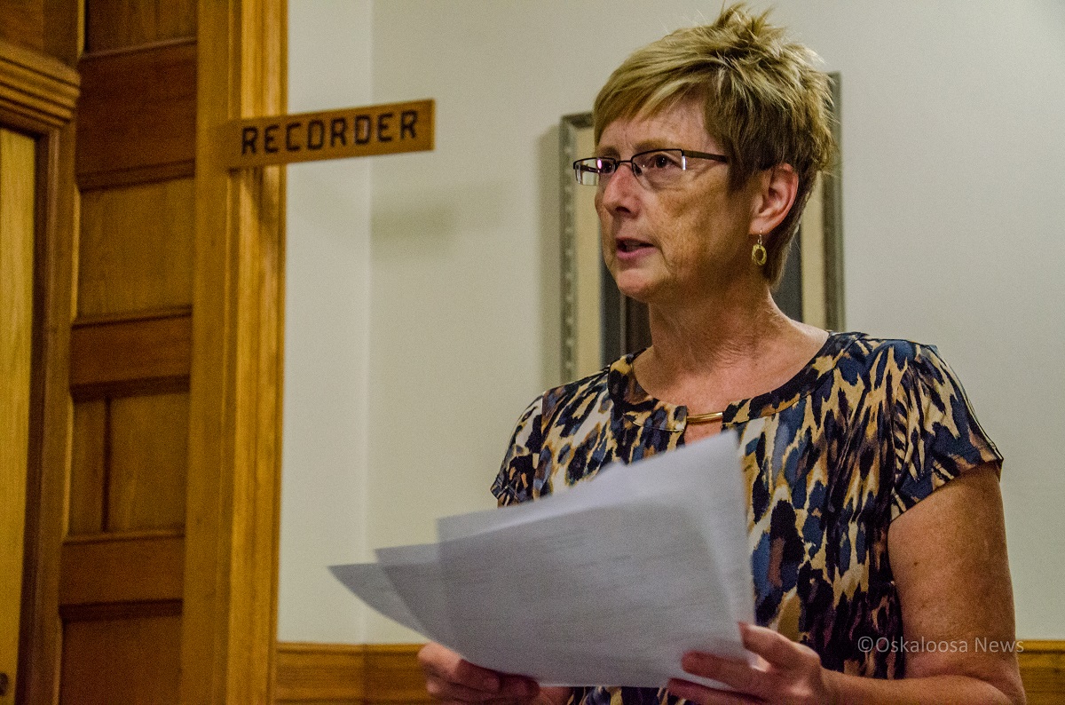Mahaska County Auditor Sue Brown reads the results of the September 10, 2013 school board election.