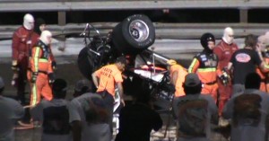 Justin Grant brought out the first red flag of the night with his tumble down the back stretch at the Southern Iowa Speedway (photo D.Hubbard)