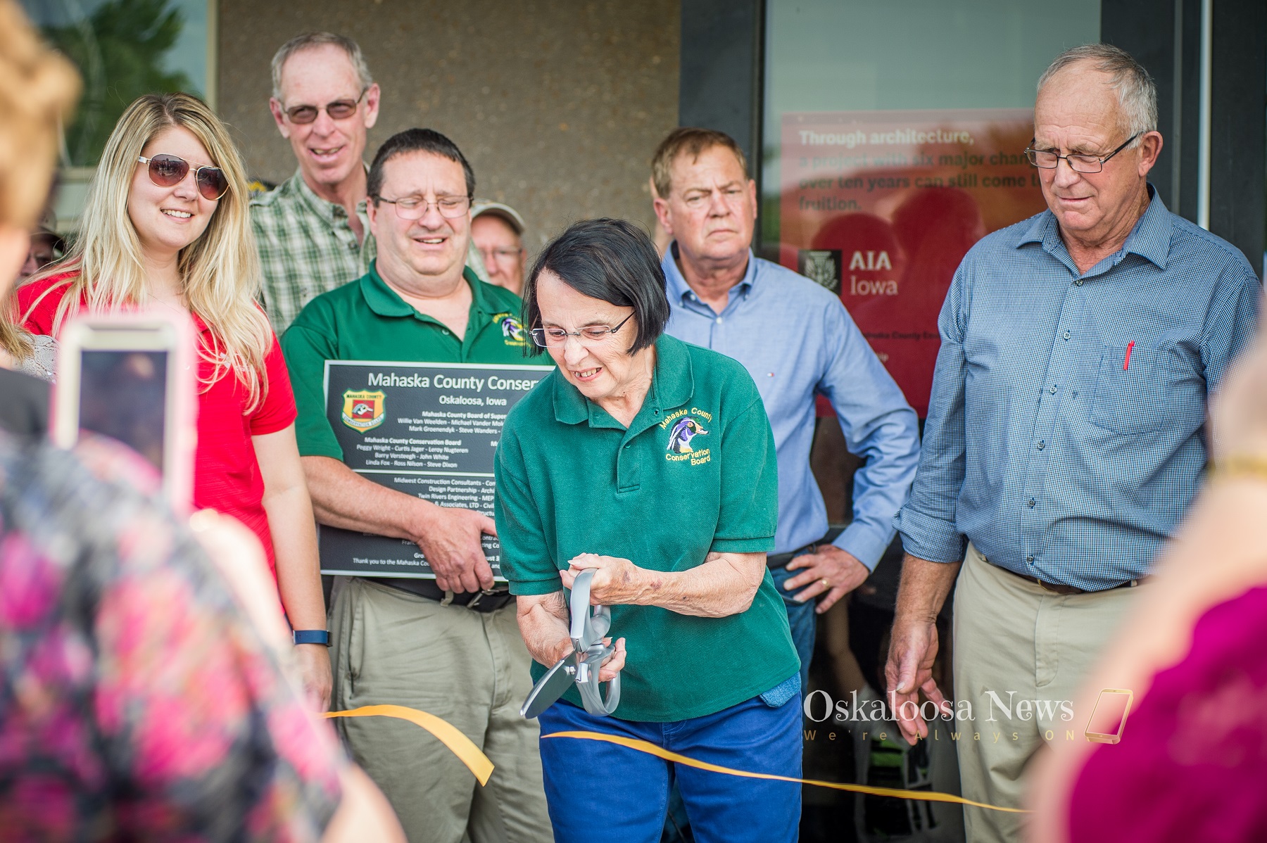 Peggy Wright, Mahaska County Conservation Board member cuts the ribbon to open the new environmental learning center.