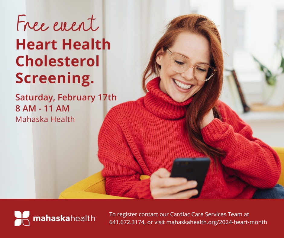 In recognition of American Heart Month, Mahaska Health, an Iowa ‘Center of Excellence for Cardiology,’ is hosting a free heart health community event. The Mahaska Health Cardiology Services team invites the community to receive free heart-related health screenings at its main campus in Oskaloosa, through door 4, on Saturday, February 17th, 2024, 8:00 am – 11:00 am. The event is open to the public, most appropriate for young to older adults.