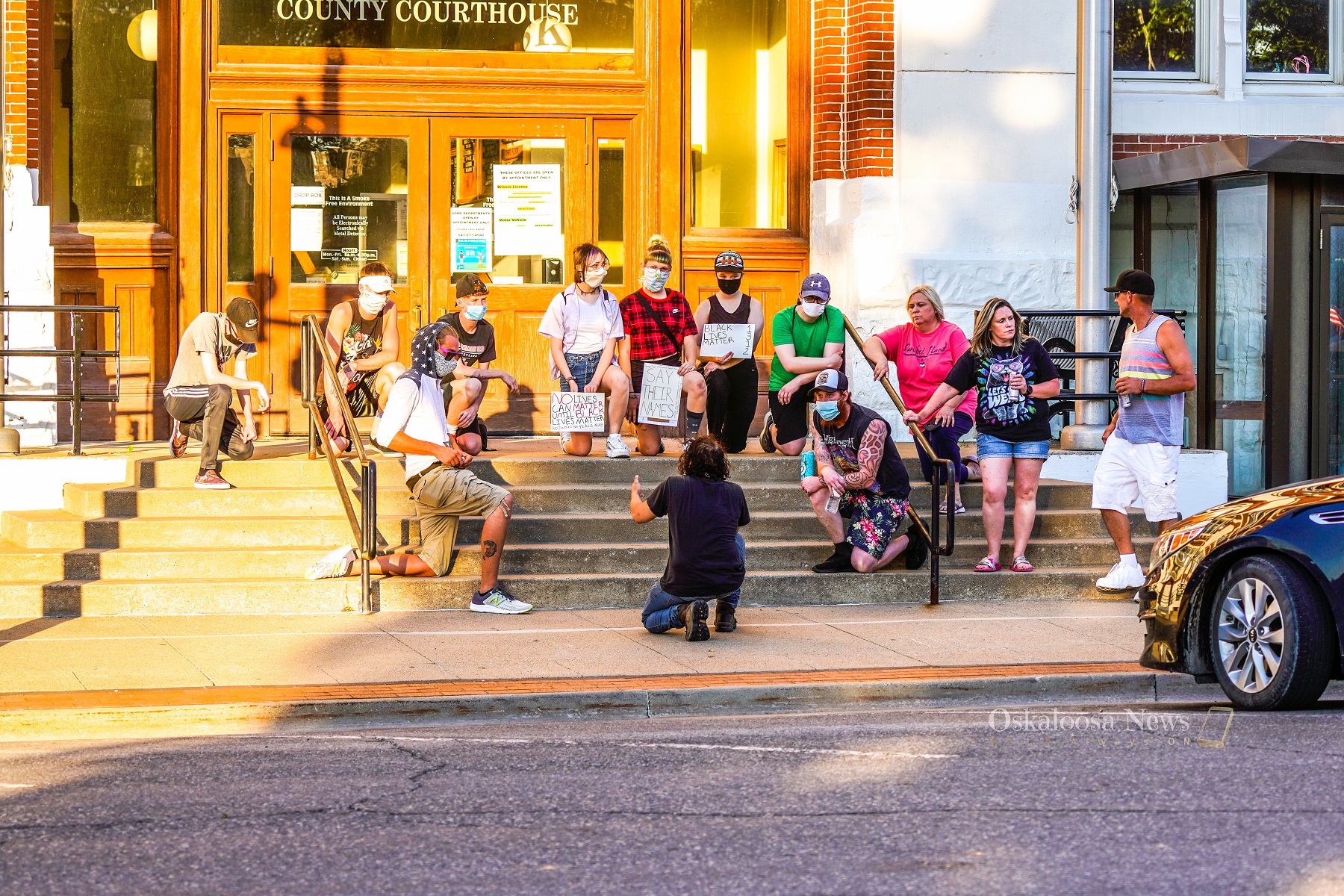 A group takes a knee on the steps of the Mahaska County Courthouse on Friday evening while listening to Loren Parks speak about racial issues in America today.