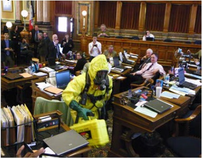 Emergency vehicles were positioned outside the statehouse for four hours while hazmat crews operated within a decontamination area to test the unknown substance. Bio-hazard testing of the letter (reportedly unstamped and hand-delivered to the legislature’s mail room), resulted in a harmless chemical which has been retained by the Iowa Division of Criminal Investigation for further study and investigate.