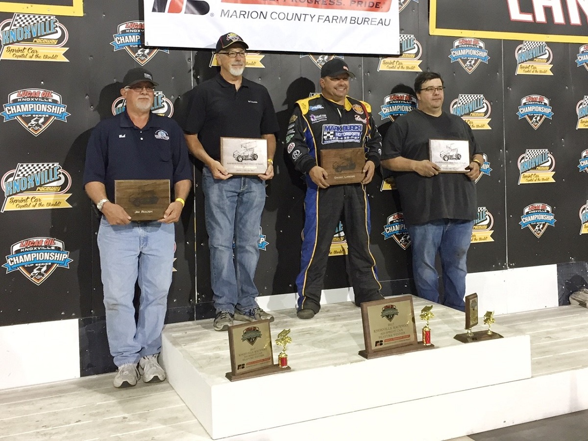 KNOXVILLE, Iowa (June 24, 2017) – It was a great day to be Danny Lasoski at Knoxville Raceway on Saturday. In the afternoon, he was inducted with three others into the Knoxville Raceway Hall of Fame. At night, he led from green to checker to earn $5,000 and his 112th victory on Marion County Farm Bureau Mid-Season Championship Night! Those joining Lasoski in the 2017 Knoxville Raceway Hall of Fame class included official Craig Johnson, official Jim Roush (accepted by son Bob) and owner/mechanic, Jeff Woodruff. Clint Garner won his third feature of the season and the 31st of his career in the 360 class. Kade Higday also won his third main event of the season in the 305 class, and the fifth in his career.