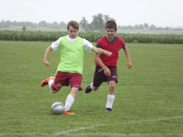 Above, the high school soccer boys stretch before the strenuous day on the field in preparation for a scrimmage to follow plus action shots after each workout of stretches and drills.