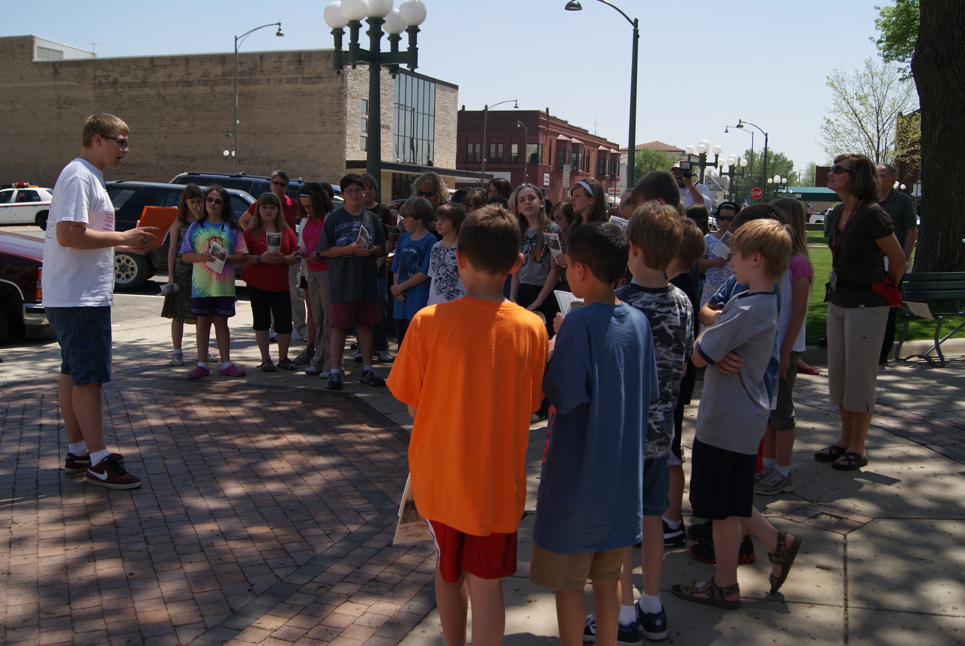 Charlie Comfort is seen here giving his walking tour to the second group of Oskaloosa 5th Graders on Thursday. (Photo D.Hubbard)
