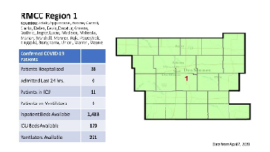 Iowa has been divided into six regions to address COVID-19. Resources to treat patients are available throughout the region. Both Mahaska and Marion Counties fall within region 1. Below is a graphic that illustrates the state, our region, and the resources available within our region.
