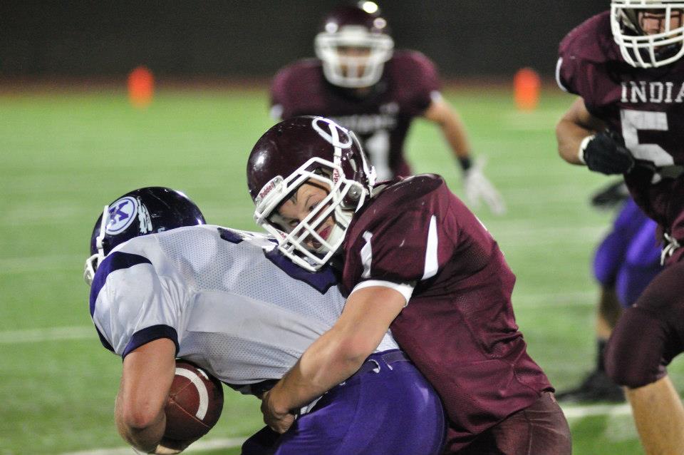 Patrick Flaherty brings down the Keokuk ball carrier during Friday nights game.