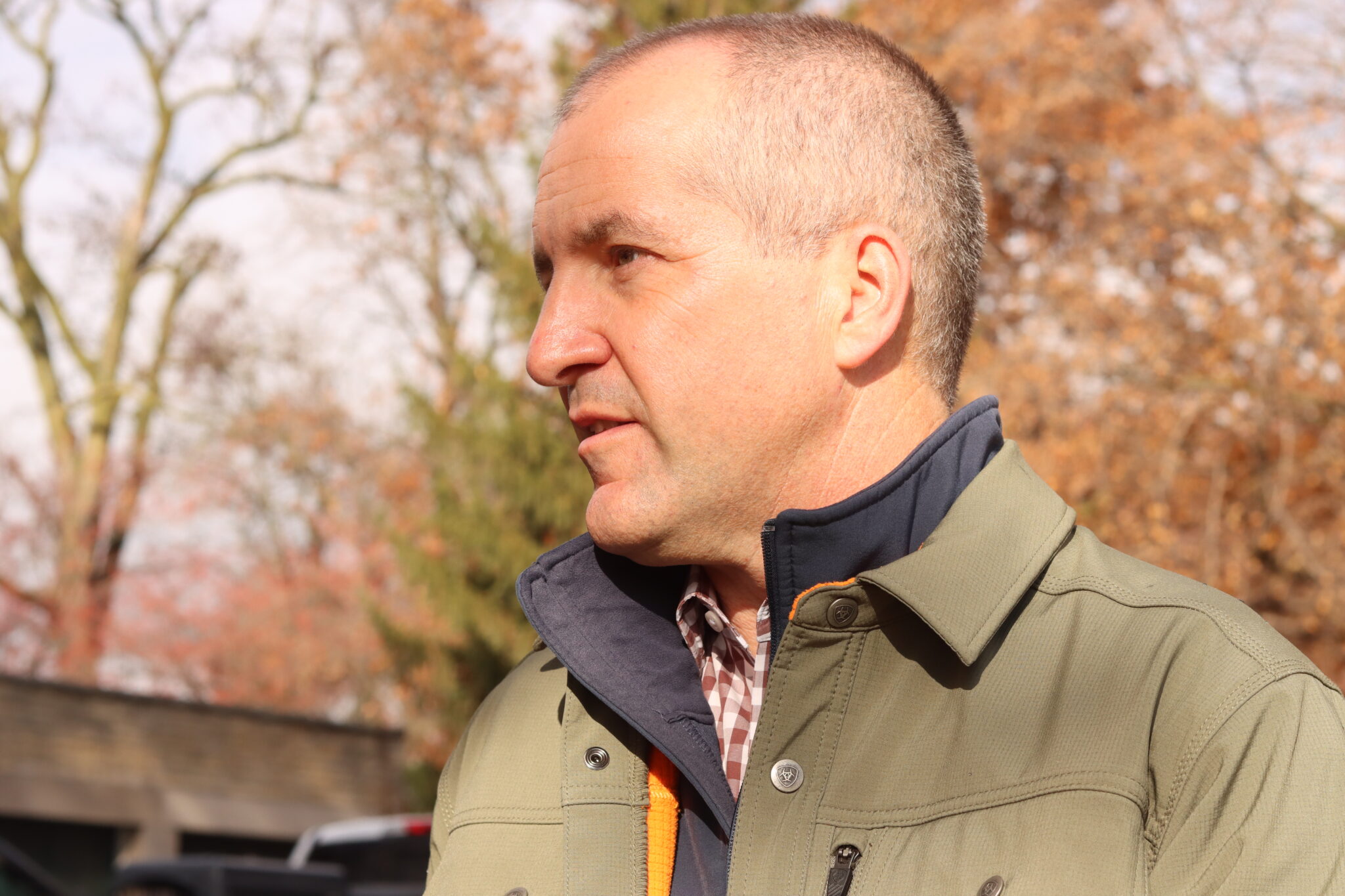 Iowa Secretary of Agriculture Mike Naig speaks with reporters at Terrace Hill following the gubernatorial pardoning of two turkeys Nov. 25, 2025. (Photo by Cami Koons/Iowa Capital Dispatch)