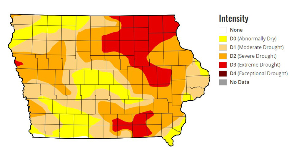 Drought conditions eclipsed their previous worst of this year, which occurred in late June and early July. Last week averaged about 10 degrees above normal in Iowa, and rainfall was about one-fifth of what is normally expected.