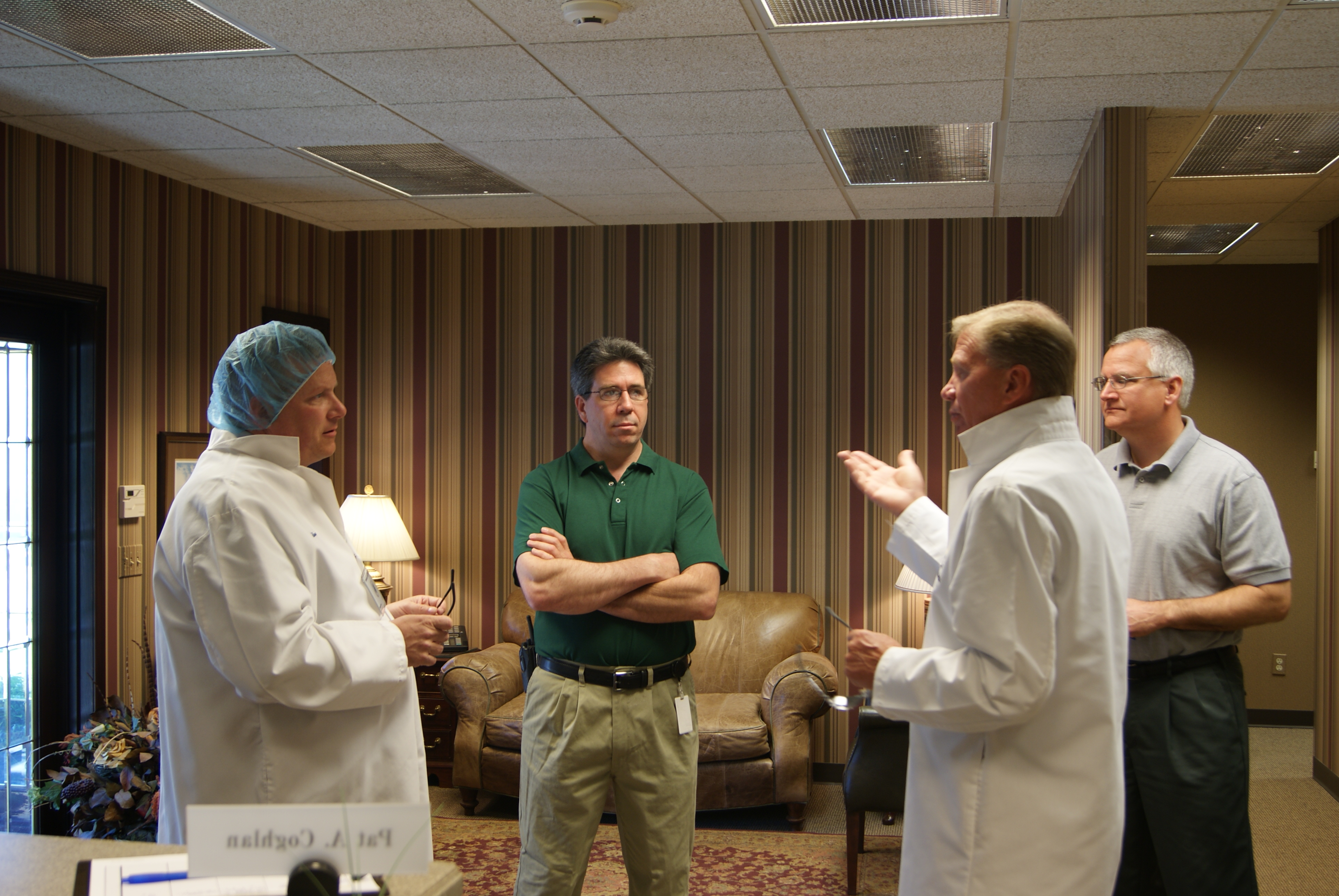 Iowa Secretary of Agriculture Bill Northey (left foreground) and Oskaloosa Food Products President Blair Van Zetten (right foreground)get prepared to tour the Oskaloosa facility (photo D.Hubbard)