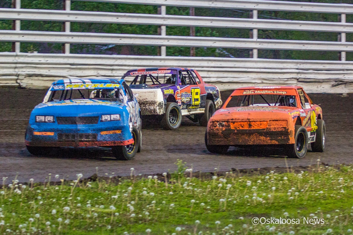 Hunter Marriott led the first lap of the 20 lap Musco Lighting IMCA Modified feature before defending track champion Colt Mather took the lead away. Mather started to pull away only to see the caution force a green-white-checkered finish. Mather held of Marriott and “Toddzilla” Todd Shute to take the feature win. CaydenCarter was fourth and Andrew Schroeder was fifth.