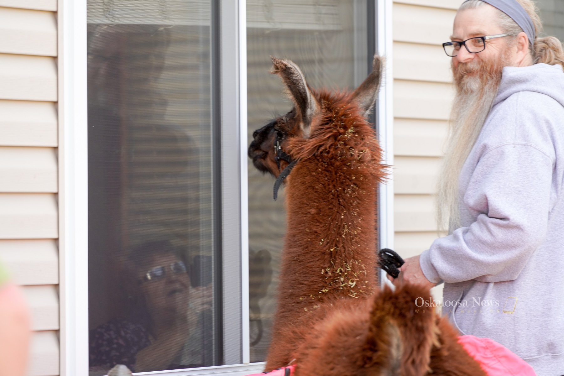 Oskaloosa, Iowa – Residents of Homestead of Oskaloosa were greeted by four llamas on Wednesday afternoon. The parade of four llamas made its way around the facility, stopping at each window to see the residents.
