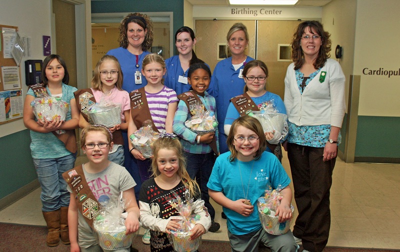 Shown are, from left, sitting: Lilly Harkin, Madison Teeter and Ariel Mullins. Middle row, left to right: Alexis Sidebottom, Katelynn Mundell, Abby Lumsden, Keke Lawrence, Alexis McCulley and troop leader Rebecca Sidebottom. Back row is MHP Birthing Center Director Chyann Vroegh, student nurse preceptor Amy Fischer and MHP Lactation Consultant Jodi Chipman. (submitted photo)