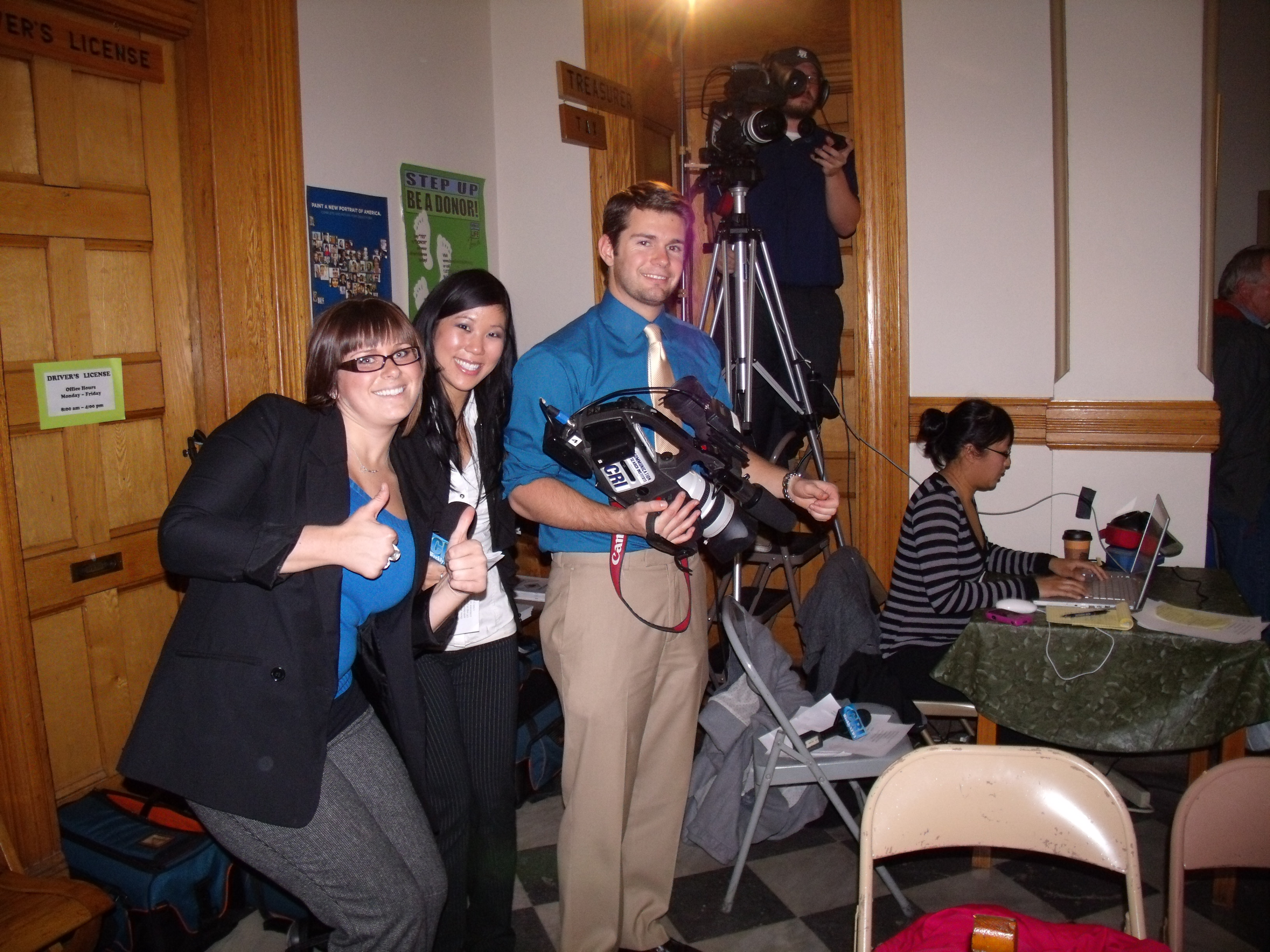 CRI's Molly Thorvilson seen here interviewing firefighters before their recent trip to Joplin (photo D.Hubbard)