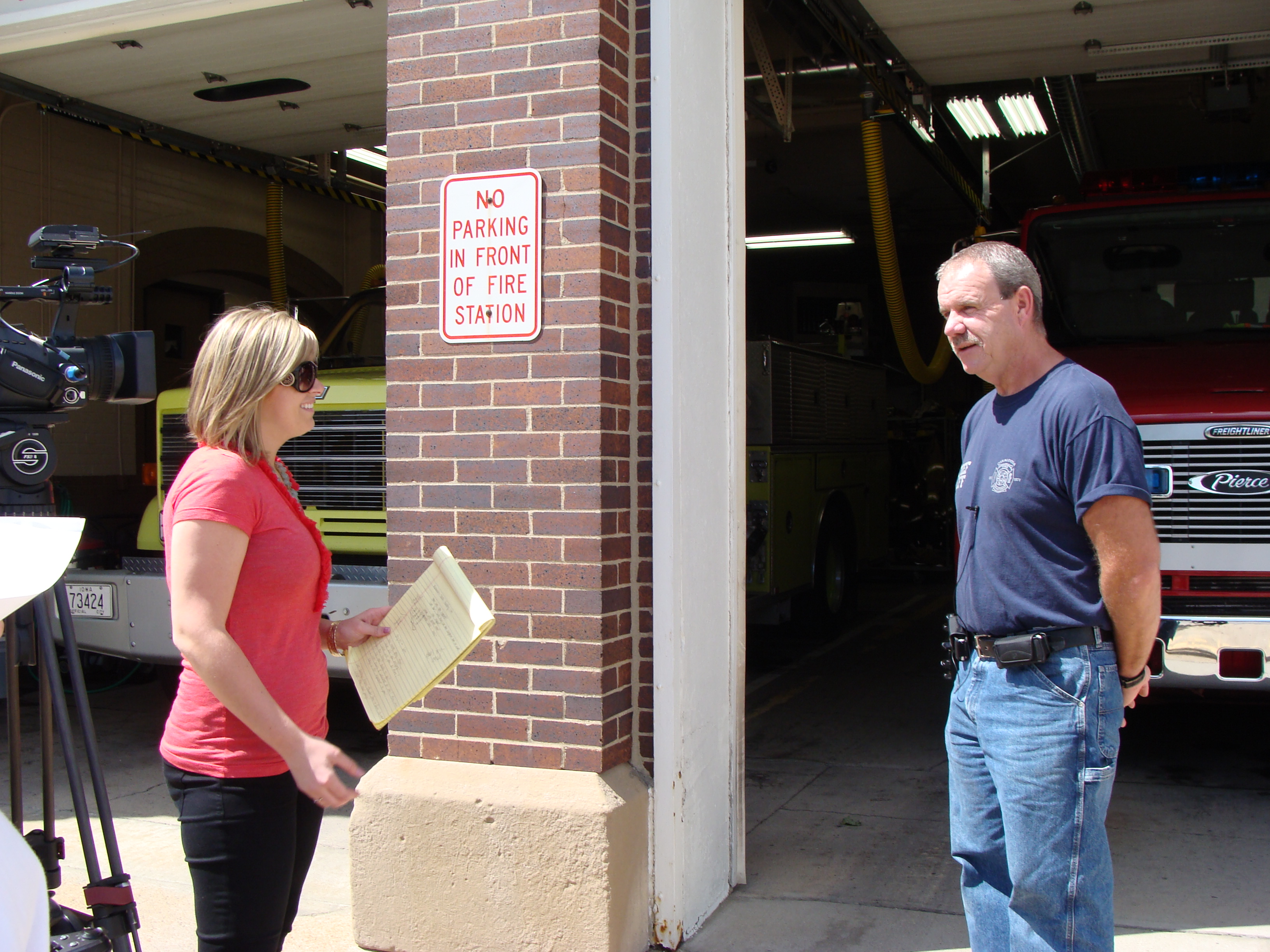 Molly Thorvilson (left) interviews Oskaloosa Fire Chief Mark Neff (right) before a local group of firefighters left for Joplin (photo D.Hubbard)