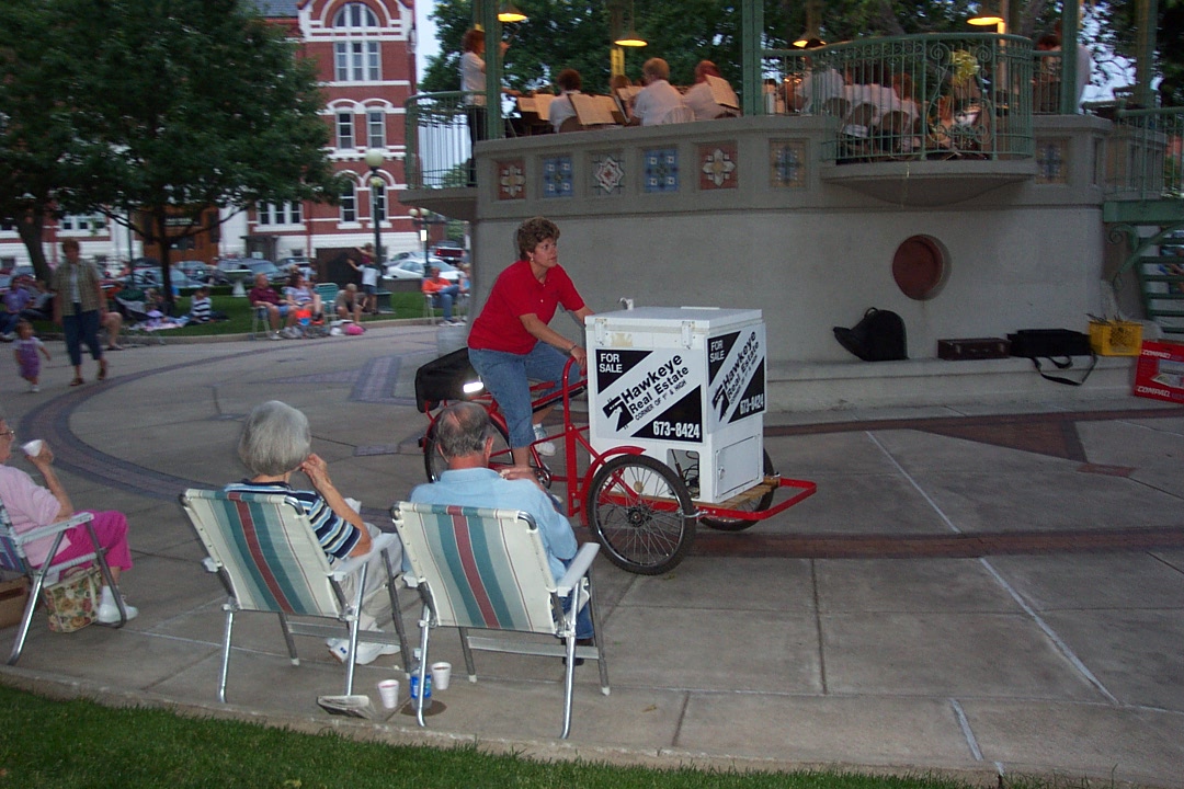 Roach is one of the Hawkeye volunteers who ride the Cooler Bike at the concerts, personally handing out the free beverages. Free drinks have been provided by Hawkeye Real Estate at the band concerts for nearly 15 years ever since the Cooler Bike was acquired by owner Lyle Siefering.