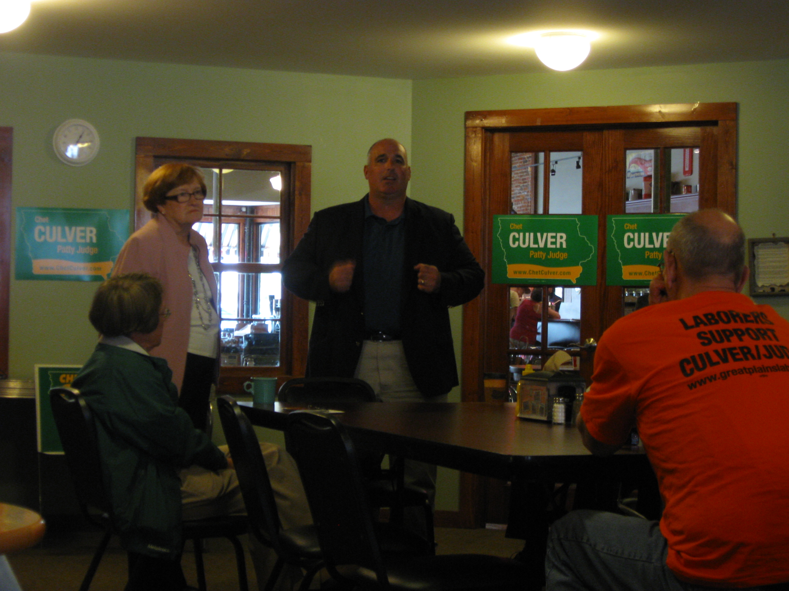 Patty was here to pass out yard signs, bumper stickers and other advertisements. Bumper stickers work best when they are applied to cars, they have very little value in drawers joked Patty Judge. She spoke of what she believes were not truthful statements by the Republican’s and Terry Branstad in trying to mislead voters. Another of their projects is making sure that they let the public know their message, getting out the vote and signing up people for early voting absentee ballot on September 23. She then stated that Chet Culver/Patty Judge ticket were not going to loose the election. They are focusing on making more campaign stops just like the one today, and Patty has challenged Governor Culver to keep up with her.