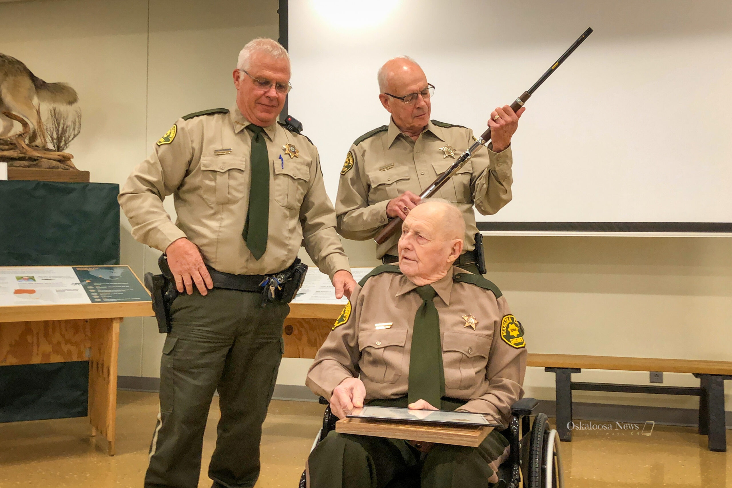 Mahaska County Sheriff Russ Van Renterghem (left), Dennis Dursky (center holding rifle), and Verlan Uitermarkt (seated) talk during a ceremony recognizing the years of service by Dursky and Uitermarkt on Sunday afternoon.