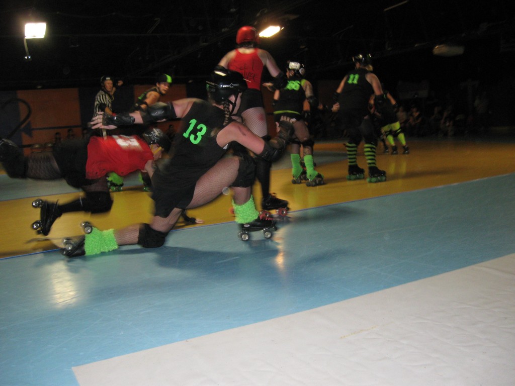 At this time, there are about 18 girls on the team spanning from 21 through 40-ish years of age. This number includes those that are side-lined with injuries.The team practices about 4 hours a week in 2- 2 hour sessions. The team informed me that the practices can get just as physical, if not more, as the bouts against other teams. They don’t hold anything back.Injuries that occur on a regular basis are bruised ribs, knees, and elbows, scratches and, of course, rink rash.