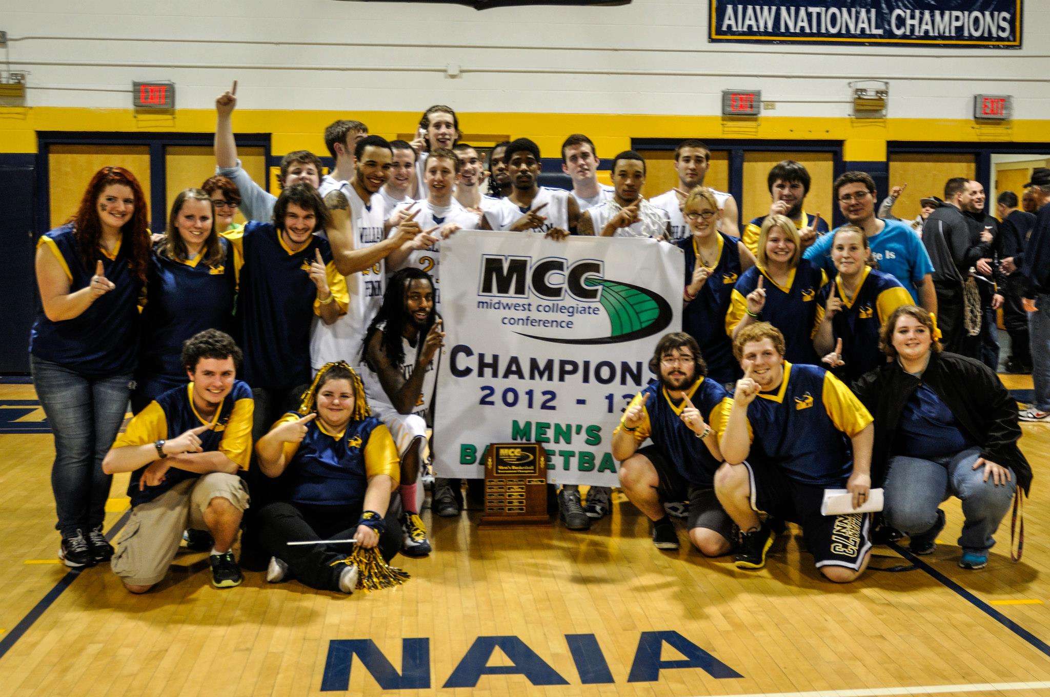 PennZone members pose with the William Penn Men’s Basketball team after they clinched the MCC Championship.