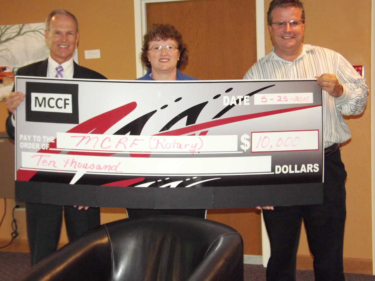 Mahaska County Community Foundation grants $20,000 to MCRF for recreation projects underway. $10,000 was received for the Skate Park project to be developed this season. The Skate park will be built by Spohn Ranch design company and will be one part of an urbane park area downtown Oskaloosa. Another $10,000 went to a project that Oskaloosa Rotary Club is planning and developing for a trail head to be located at Hwy 163 and Ave E cross streets, next to the new Nazarene Church. The trail head will have eight parking spaces and a gazebo for resting. Pictured are Madonna Bowie from MCCF; Alan Fender and Tim Kurtz from Rotary.