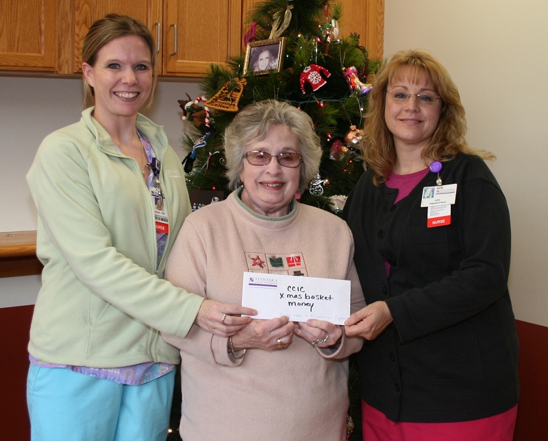 The Mahaska Health Partnership Cancer Care and Infusion Center (CCIC) raised $1,573.50 from their Annual Christmas Basket Auction. Proceeds were designated to the Ecumenical Food Cupboard in Oskaloosa. Shown at the check presentation are, from left MHP CCIC Nurse Jessie Bihn, Ecumenical Food Cupboard Manager Shirley Frey and CCIC Nurse Sally Blake.
