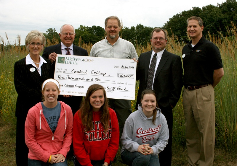 PELLA — The MidWestOne Foundation presented the first portion of a $10,000 grant to Dr. Russ Benedict, associate professor of biology at Central College, on Aug. 30 at the college’s Carlson-Kuyper Field Station. The award, to be received in four equal payments over four years, provides funding for the Prairies for Agriculture project. Joining Benedict in accepting the grant were Dave Sutphen, vice president of advancement, and Central students working on the project.