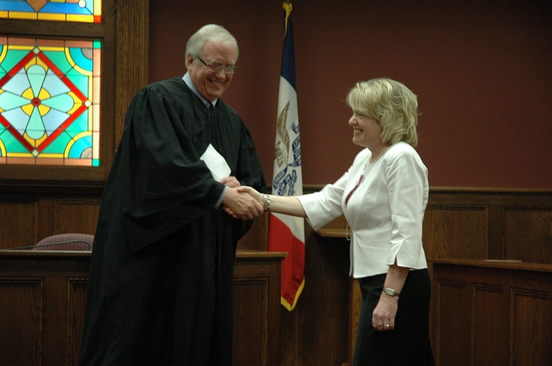 8th Judicial District Chief Judge, James Blomgren shakes Teresa Augustine's hand after swearing her in as the new Mahaska County Clerk of Court