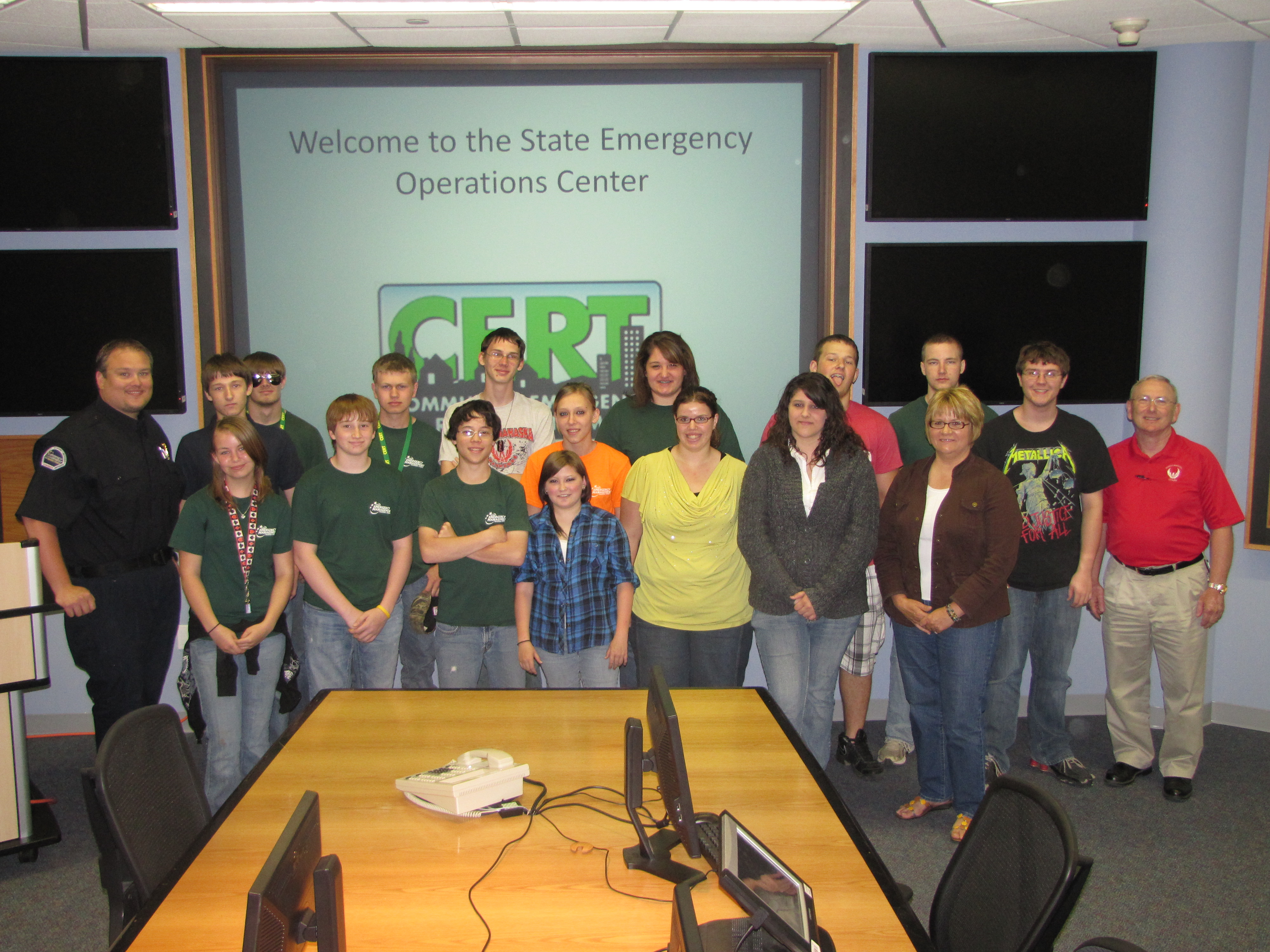 For the past 2 weeks, Jamey Robinson, Mahaska County Emergency Manager has been working on training old and new members of the New Sharon Teen CERT Team. Members of the Teen CERT Team traveled to Des Moines to visit the Emergency Operations Center [EOC] where they ran a scenario of a tornado hitting Oskaloosa to learn what they needed to do and how they would respond.