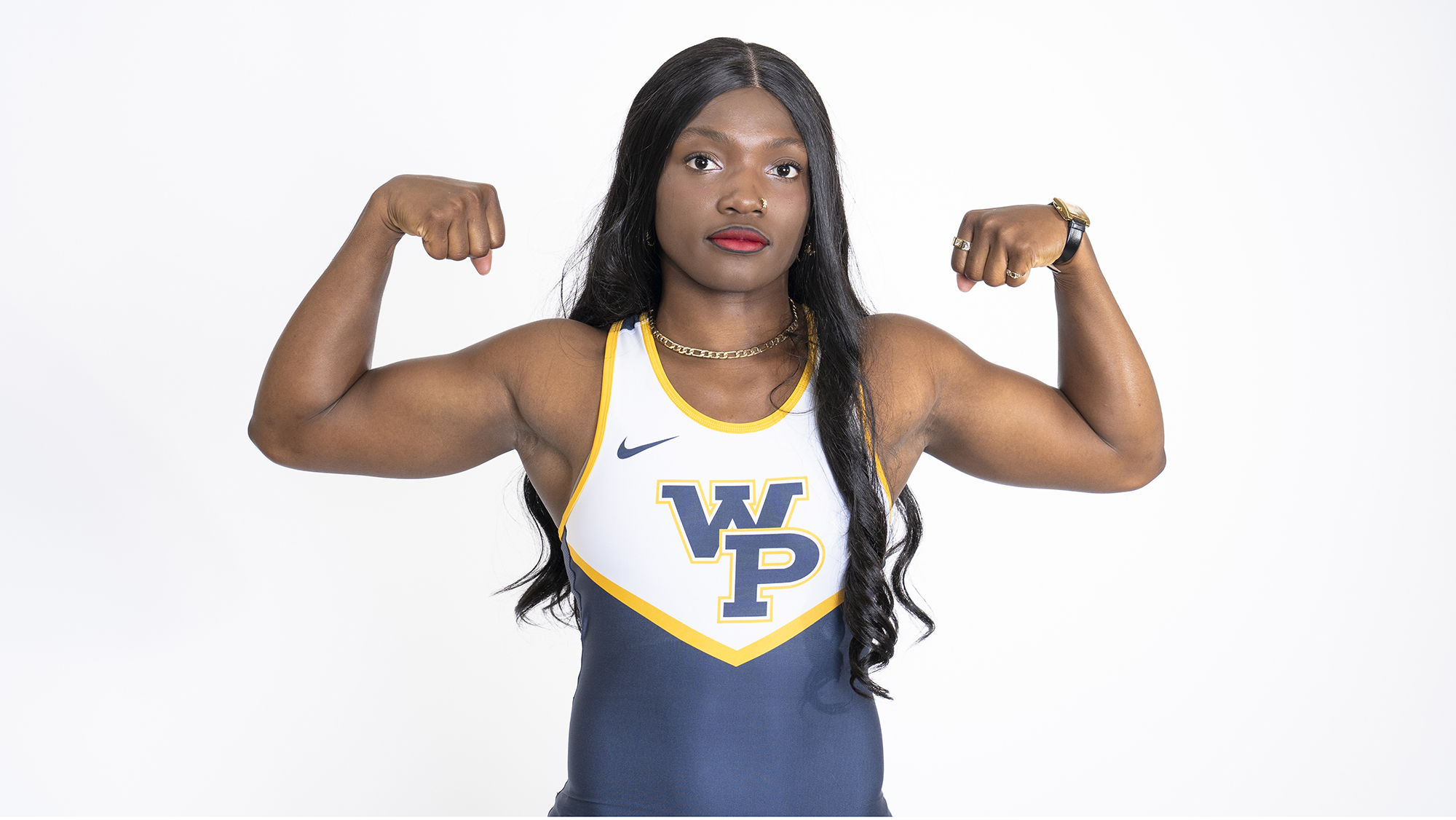 Adaugo Nwachukwu poses for a staged photo in the Athletic Communication Office on Friday, Oct. 06, 2023. (Photo by Jordan Lester/William Penn Athletics)