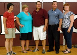 From left to right: Ginny Foster, Cyndy Gray (Oskaloosa Schools) Scott VanVeldhuizen, Todd Carriker (Oskaloosa Indian Boosters), Madonna Bowie (George Daily Trust and MCCF)