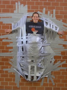 Physical Education teacher Betsy Luck was taped to the wall with duct tape as the Oskaloosa Middle School