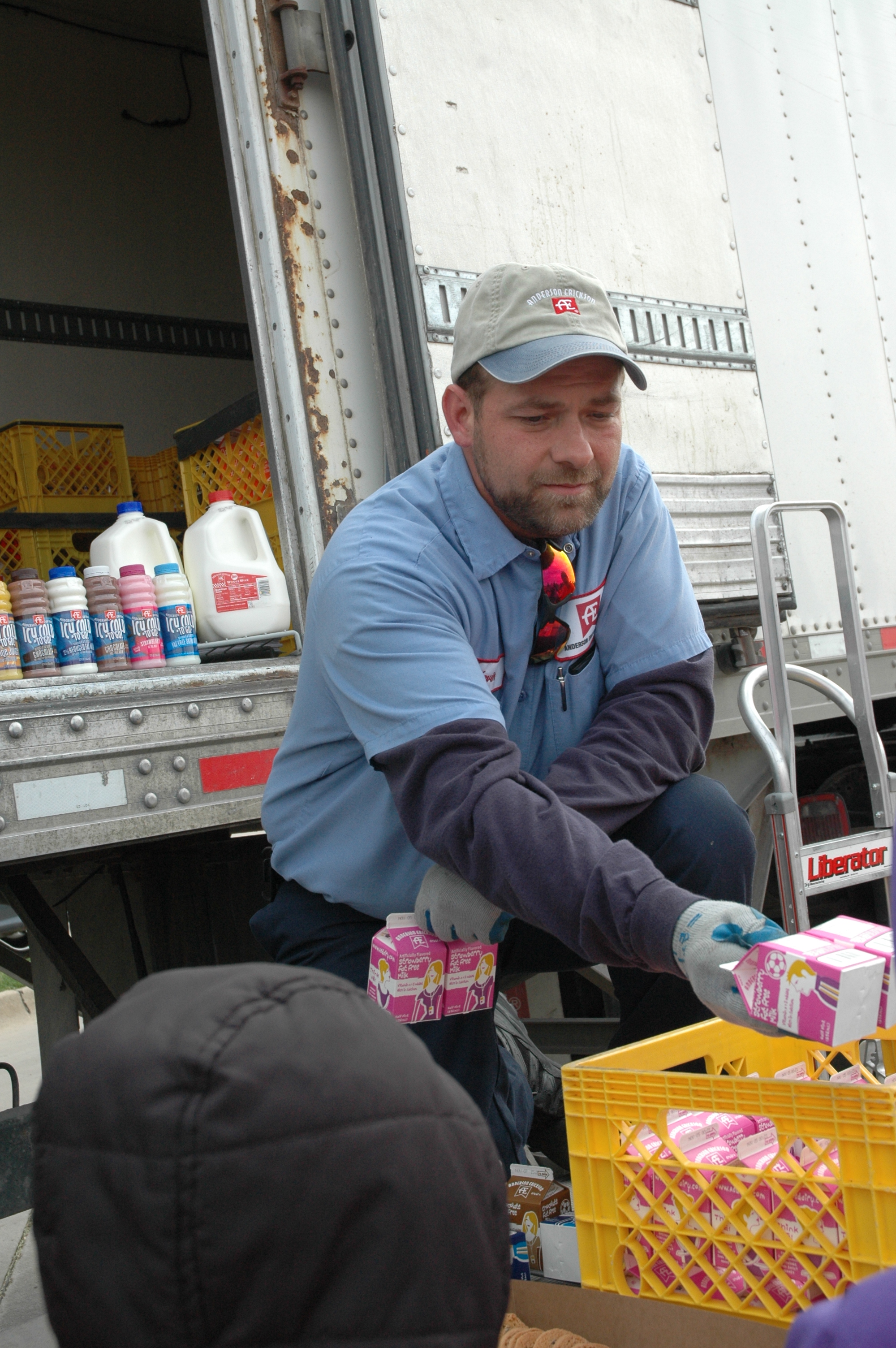 Oskaloosa, Iowa – With the rustling of coats and the chatter that is unmistakable, nine Kindergarten classrooms at the Oskaloosa Elementary School  made their way outside to visit with Kevin Dillon of Anderson Erickson Dairy. Kevin was there to greet the students and show them the delivery truck while serving them a carton of strawberry milk. Jaarsma Bakery provided a cookie snack while Dillon spoke about AE and what he does for them.