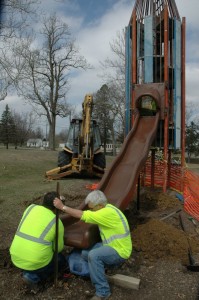 While heading off to a different story, we spotted a city crew at the slide. We feared the icon had met it’s day and was headed for the scrap heap. As we parked, thinking that we were going to possibly be taking one of the last photo’s of the slide, we were intrigued to see a crew working on retrofitting a new plastic slide in place of the old metal slide.
