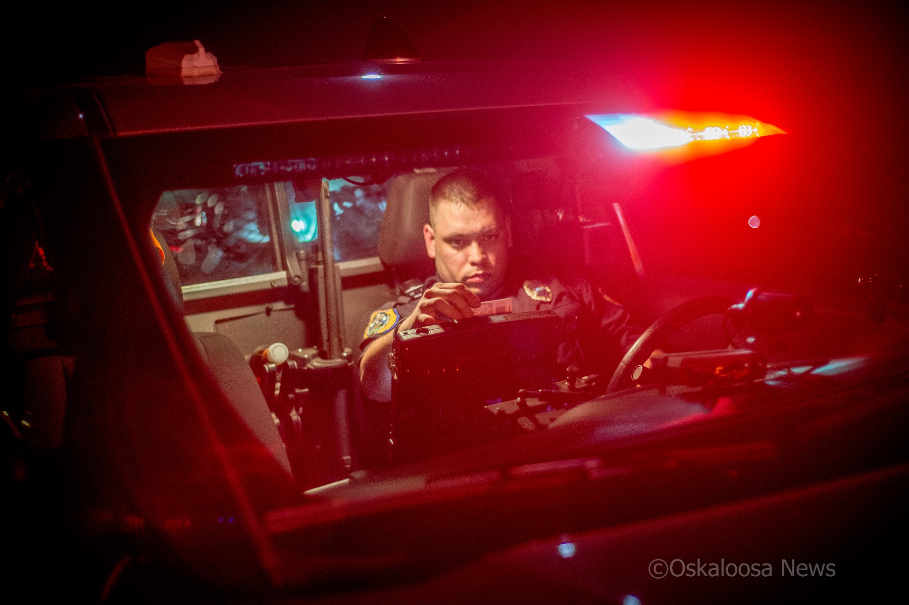 Oskaloosa Police Officer Nick Landgrabe works a traffic stop in the city of Oskaloosa on Saturday night.