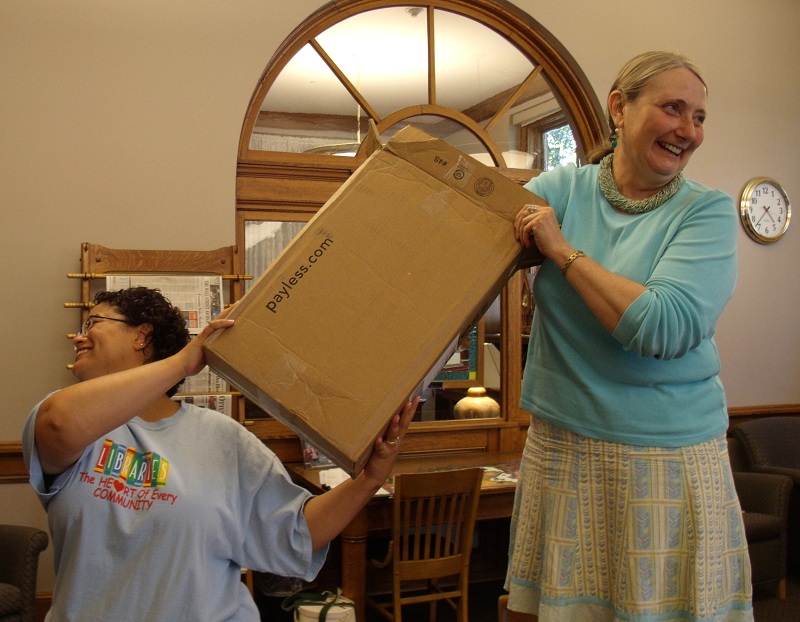 Aiyanna Looney (left) and Oskaloosa Library Director Wanda Gardner (right) draw the big winner on Friday afternoon.