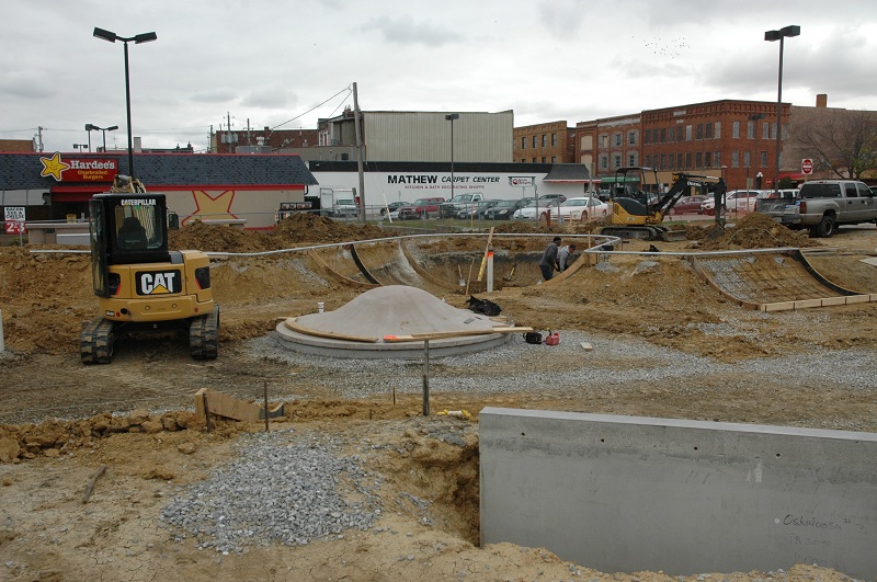 Oskaloosa, Iowa – Digging has nearly been completed and workers are readying to begin shooting concrete to make all of the features of the new skate park. The skate park is beginning to take shape in front of Penn Central Mall.  Workers hope to have all the raised elements completed by the end of next week.