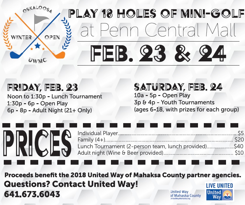 This February, United Way of Mahaska County, along with 14 local nonprofit partners, will be hosting the 7th Annual Oskaloosa Winter Open. Each hole along the course will be co-hosted by a UWMC partner agency and a business sponsor.