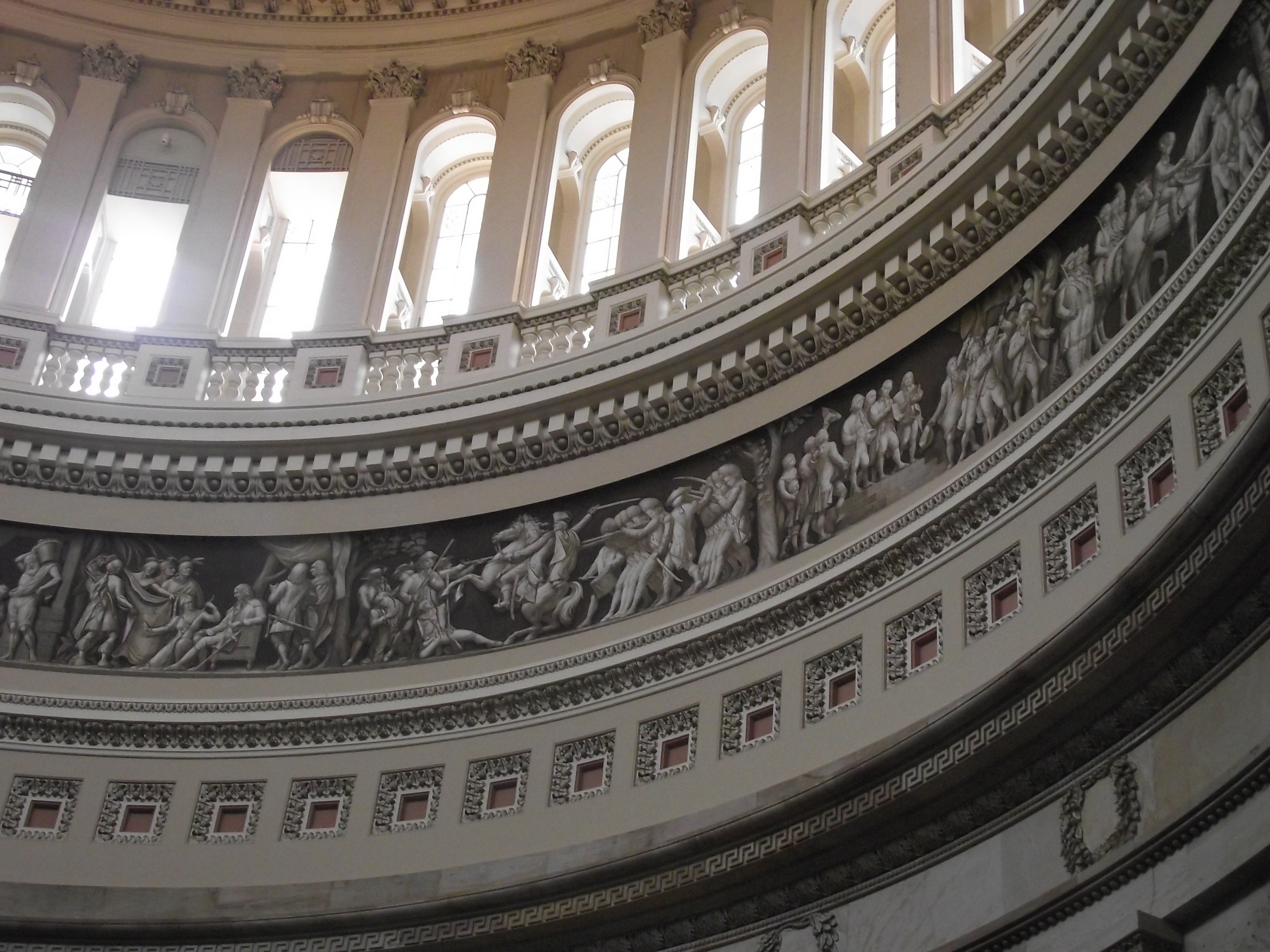 Another large painting is visible within the rotunda. This painting stretches all the way around the Capital Rotunda. It is called the “Frieze of American History” and