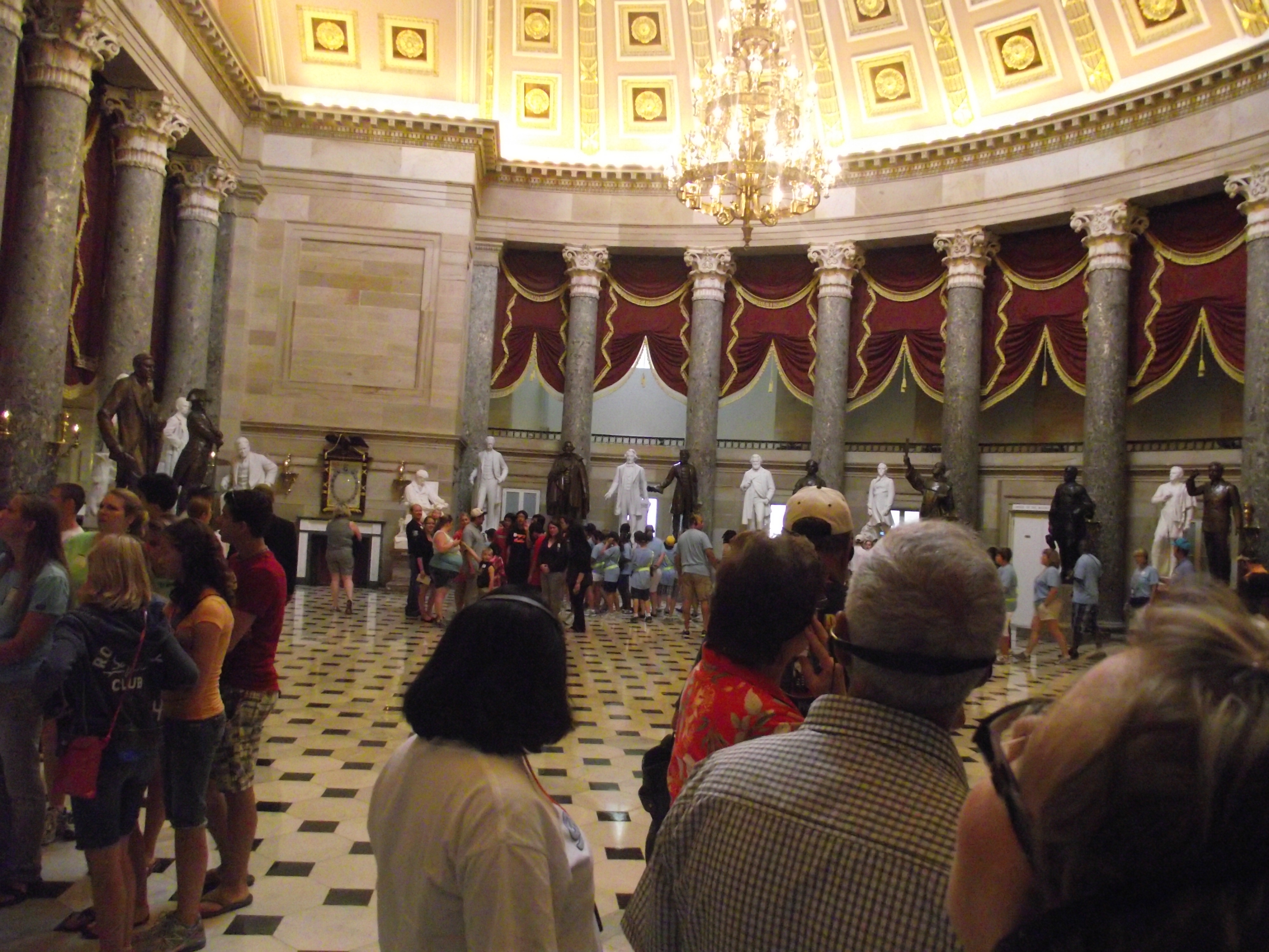After being shown a video, we were placed into lines to begin the tour. We were taken up two flights of stairs before stopping at our first location. That first stop was the Capital Rotunda. The rotunda itself is one of the defining aspects of the building. It can be seen from all over DC. Our guide stopped us in front of an oil-on-canvass painting and allowed us to take pictures while she talked about the rotunda. Within the rotunda, there are eight oil-on-canvass paintings, all of which depict historical parts of American History. The most commonly viewed painting is the Signing of the Declaration of Independence. We were stopped in front of this particular painting. Four of the paintings in the Rotunda depict scenes from the American Revolution and are painted by John Trumbull. The other four depict scenes from the exploration of America and are painted by various other artists. The Trumball paintings are the most popular of the eight.