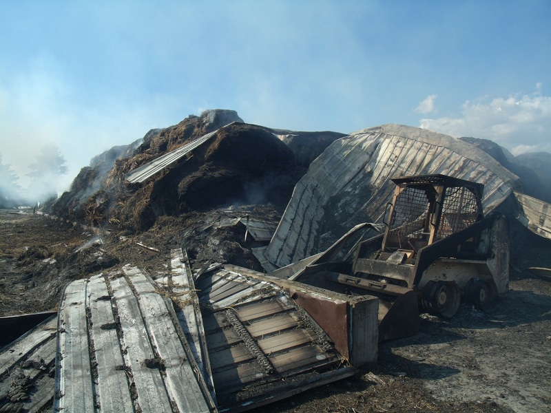 It appears that a fire started from an electrical short in a Bobcat, caused the machinery to burn, and then ultimately caused the hay inside a metal barn to catch fire.